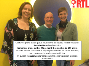 C’est avec grand plaisir que je participerai à l’émission les bonnes ondes avec Sandrine Dans ce mardi de 14h à 16h sur Bel RTL. En cette veille de rentrée scolaire rimant pour certains avec départ en Kot et Erasmus, nous parlerons du syndrome du nid vide! Et qui sait peut-être que Jacques Mercier sera à nouveau présent avec son savoir-rire! Bonne rentrée à tous!
