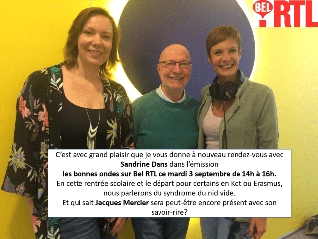 C’est avec grand plaisir que je participerai à l’émission les bonnes ondes avec Sandrine Dans ce mardi de 14h à 16h sur Bel RTL. En cette veille de rentrée scolaire rimant pour certains avec départ en Kot et Erasmus, nous parlerons du syndrome du nid vide! Et qui sait peut-être que Jacques Mercier sera […]